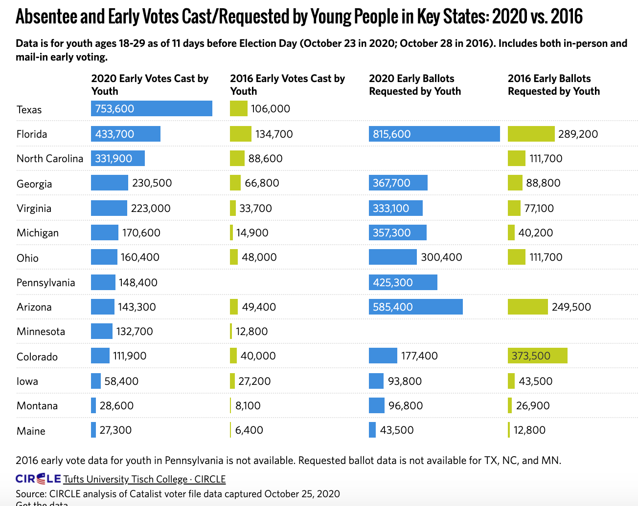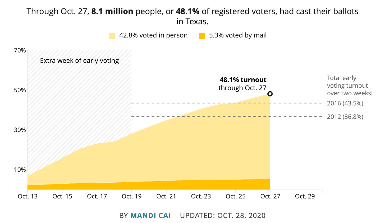 Back to the youngs. Above is a graphic from Tufts University showing 2020 youth turnout compared to 2016. The Texas number is eye popping. The vote differential between Trump and Clinton in Texas in 2016 was 647,600, and the youngs have already cast 753,600 ballots. While clearly Biden isn’t winning 100% of those votes, he is leading among 18-29 year olds by 22 pts or so according to recent polls.