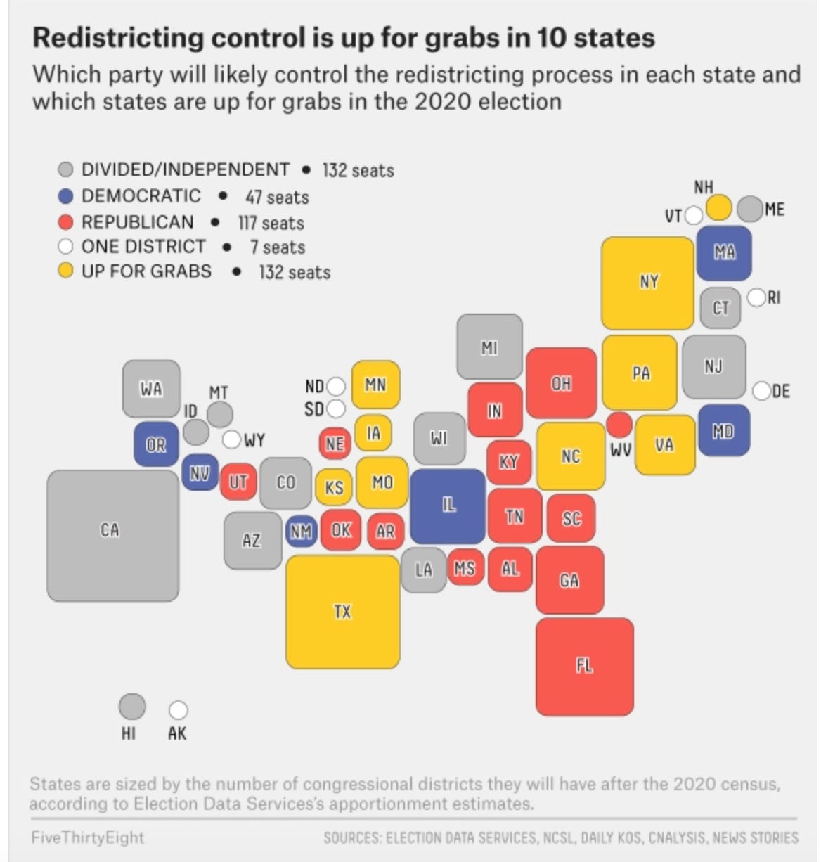 FiveThirtyEight has an easy to understand section on redistricting including the cool graphic below. Worth checking out.
